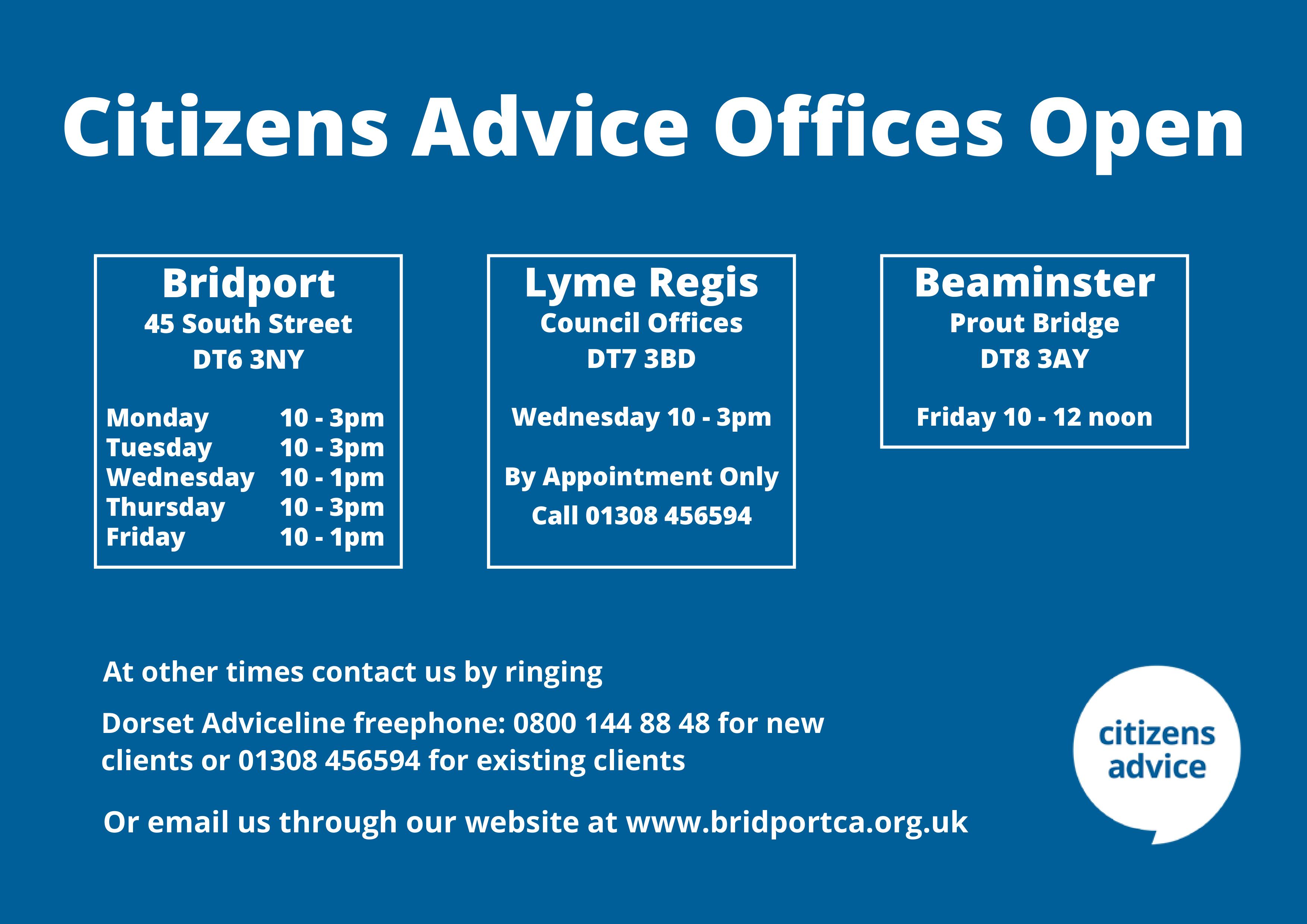 We are a local charity and part of the Citzens Advice network nationally. We provide free, Independent, confidential and impartial advice and campaign on big issues affecting people's lives. People come to us with all sorts of issues. You may have money, benefit, housing or employment problems. You may be facing a crisis, or just considering your options. We value diversity, promote equality and challenge discrimination wherever we see it. Click here to find out more about what you can expect from the service provided by Bridport & District Citizens Advice. Click here for a link to the national Citizens Advice website for online help on a range of topics such as debt, housing, legal and others.